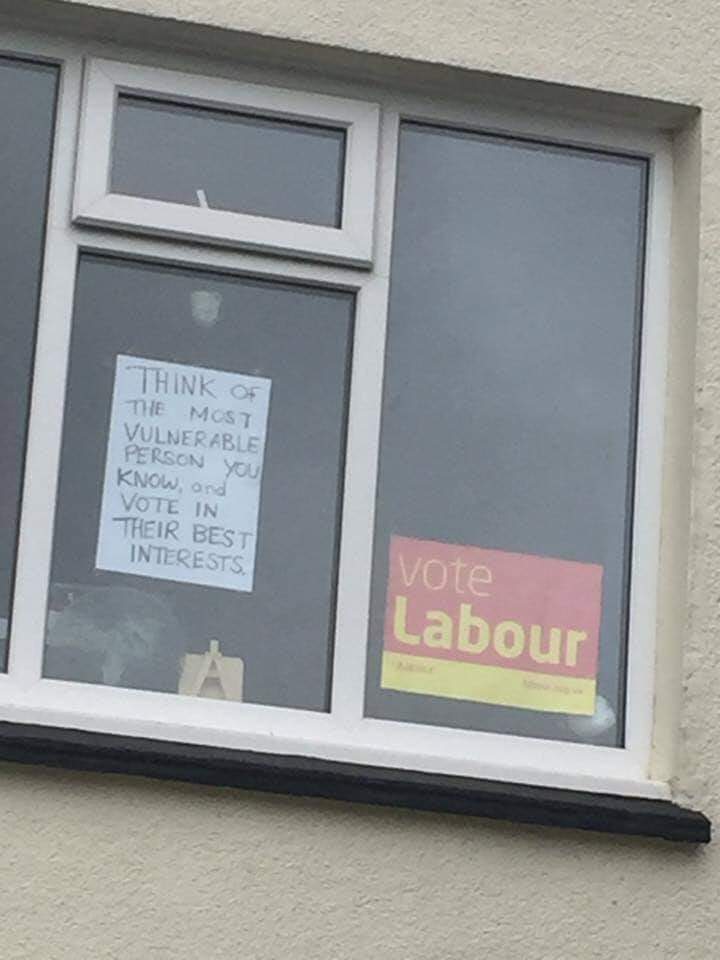 I sit in tears after reading a hand-written poster that’s doing the rounds. It says “THINK OF THE MOST VULNERABLE PERSON YOU KNOW, and VOTE IN THEIR BEST INTERESTS”. Sitting next to a Vote Labour sign. I cry because there are so many people who need more support and because I know Labour is going to lose.